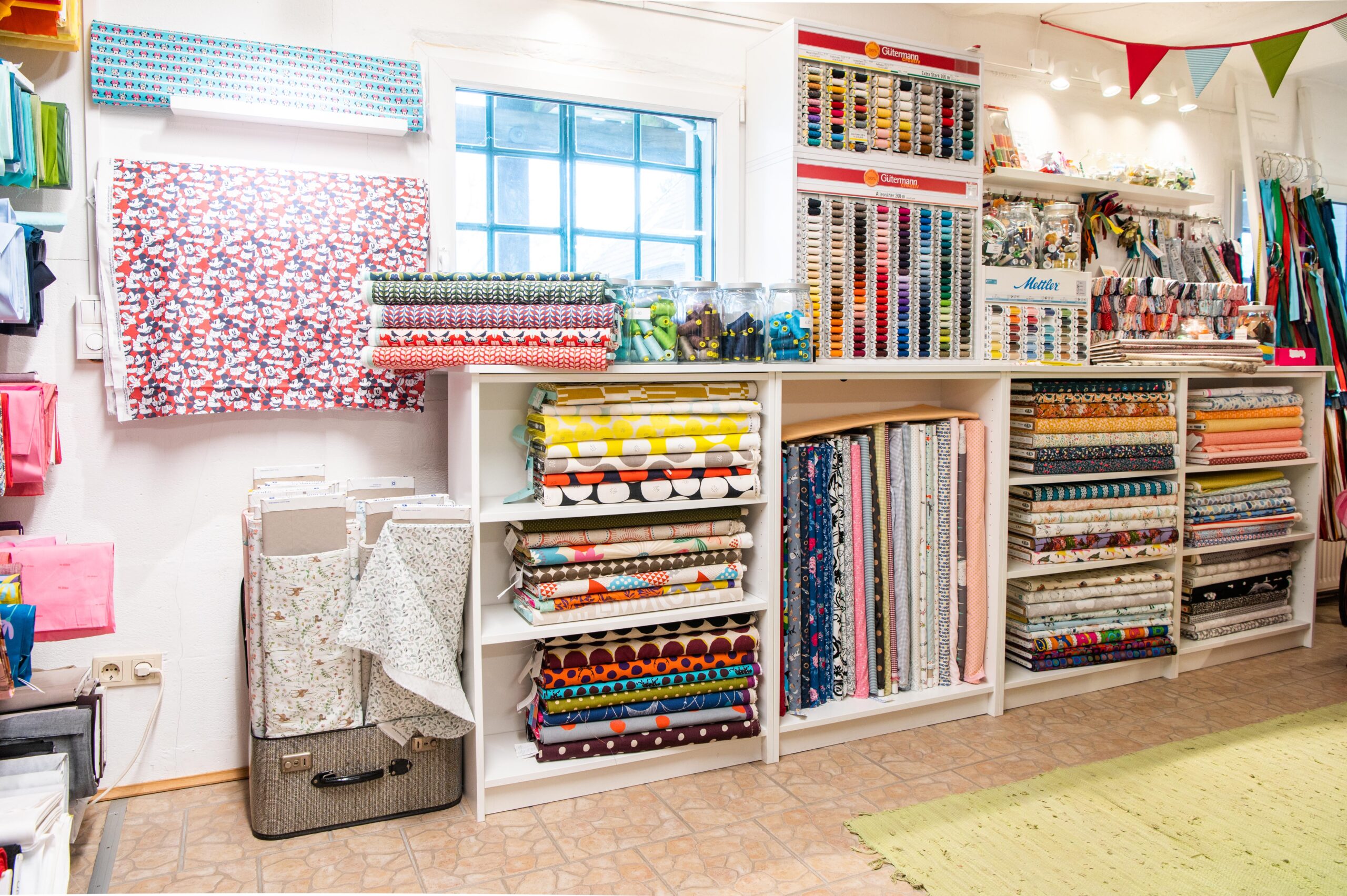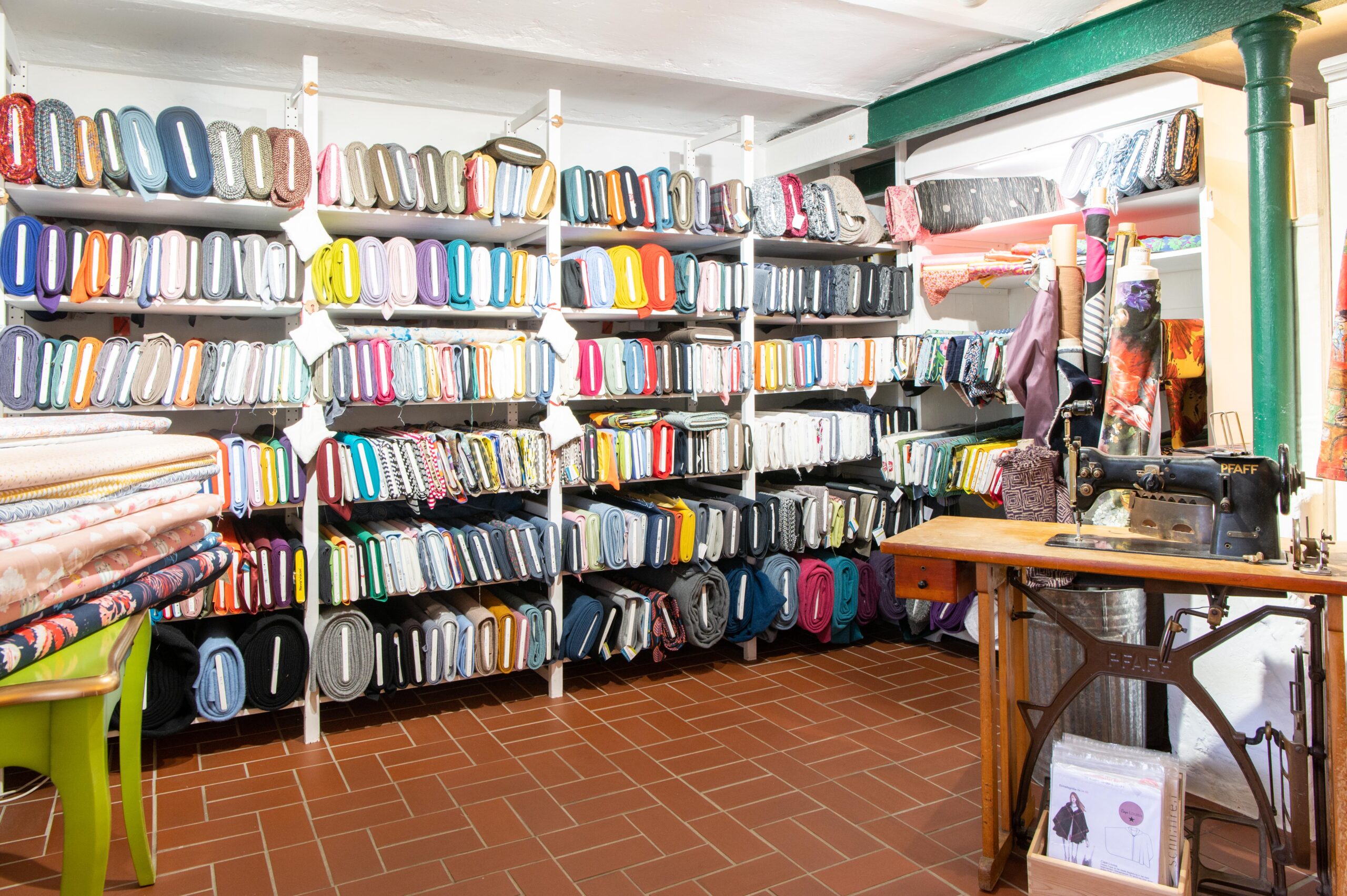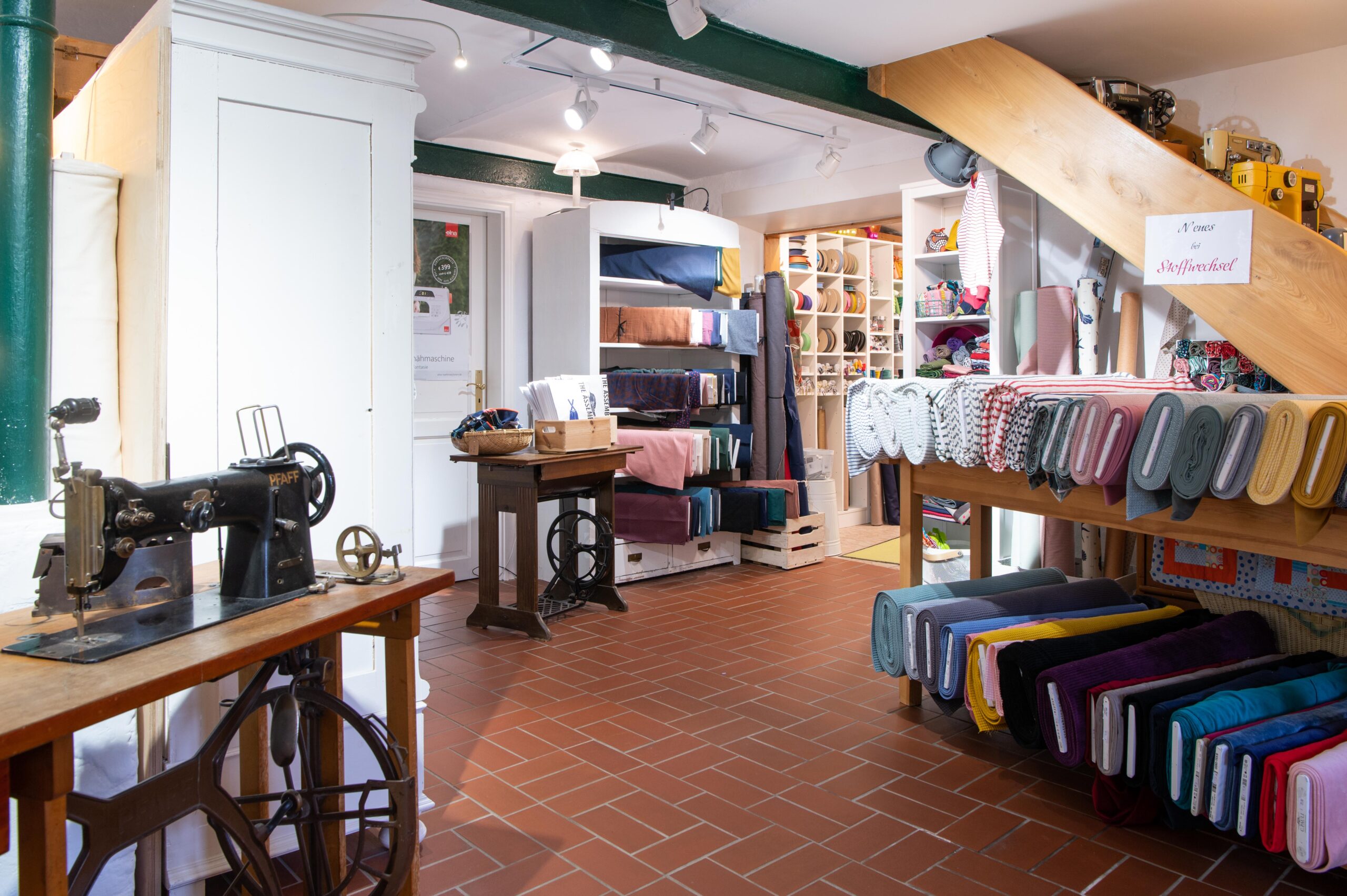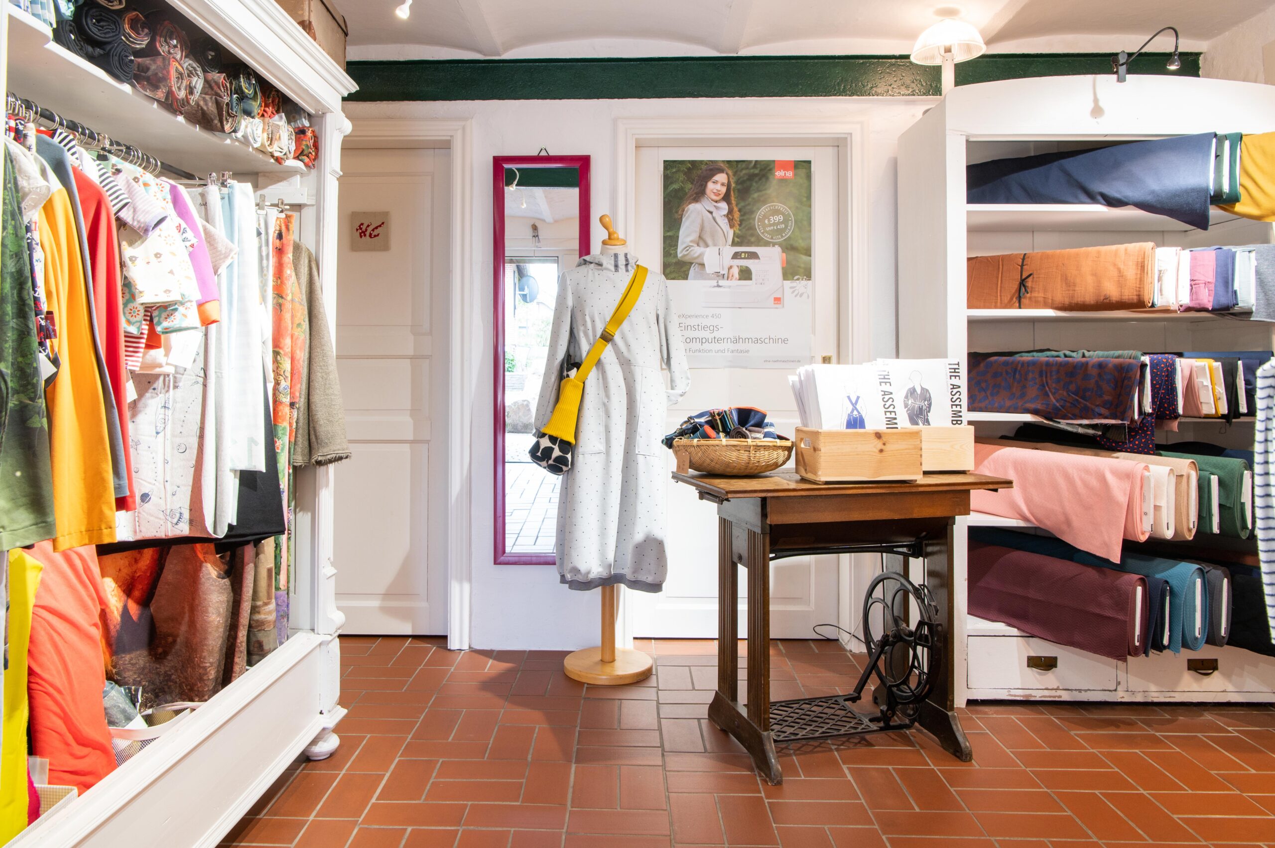 Von einer riesengroßen Auswahl an Stoffen, Schnittmustern, Büchern und passendem Zubehör sowie Nähmaschinen der Marke Elna.
